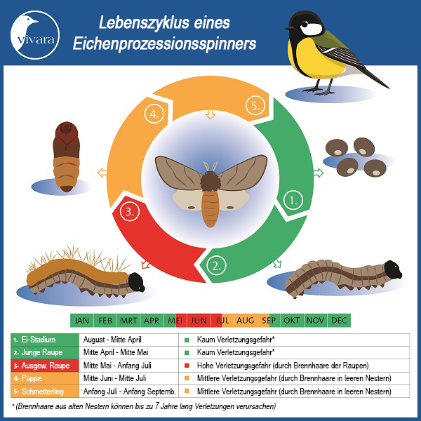 Der Eichenprozessionsspinner durchläuft einen Lebenszyklus vom Ei bis zum Schmetterling. Zum Selbstschutz entwickelt die Raupe Brennhaare, um sich gegen Gefahren zu wehren. Diese Haare sind meist im Mai vollständig entwickelt – deshalb ist die Belästigung in dieser Zeit bis etwa Anfang/Mitte Juli am größten. Zurückgebliebene Haare aus alten Nestern können jedoch noch über mehrere Jahre hinweg Beschwerden verursachen. Daher ist es wichtig, die Raupen zu bekämpfen, bevor sie ihre Brennhaare ausbilden.