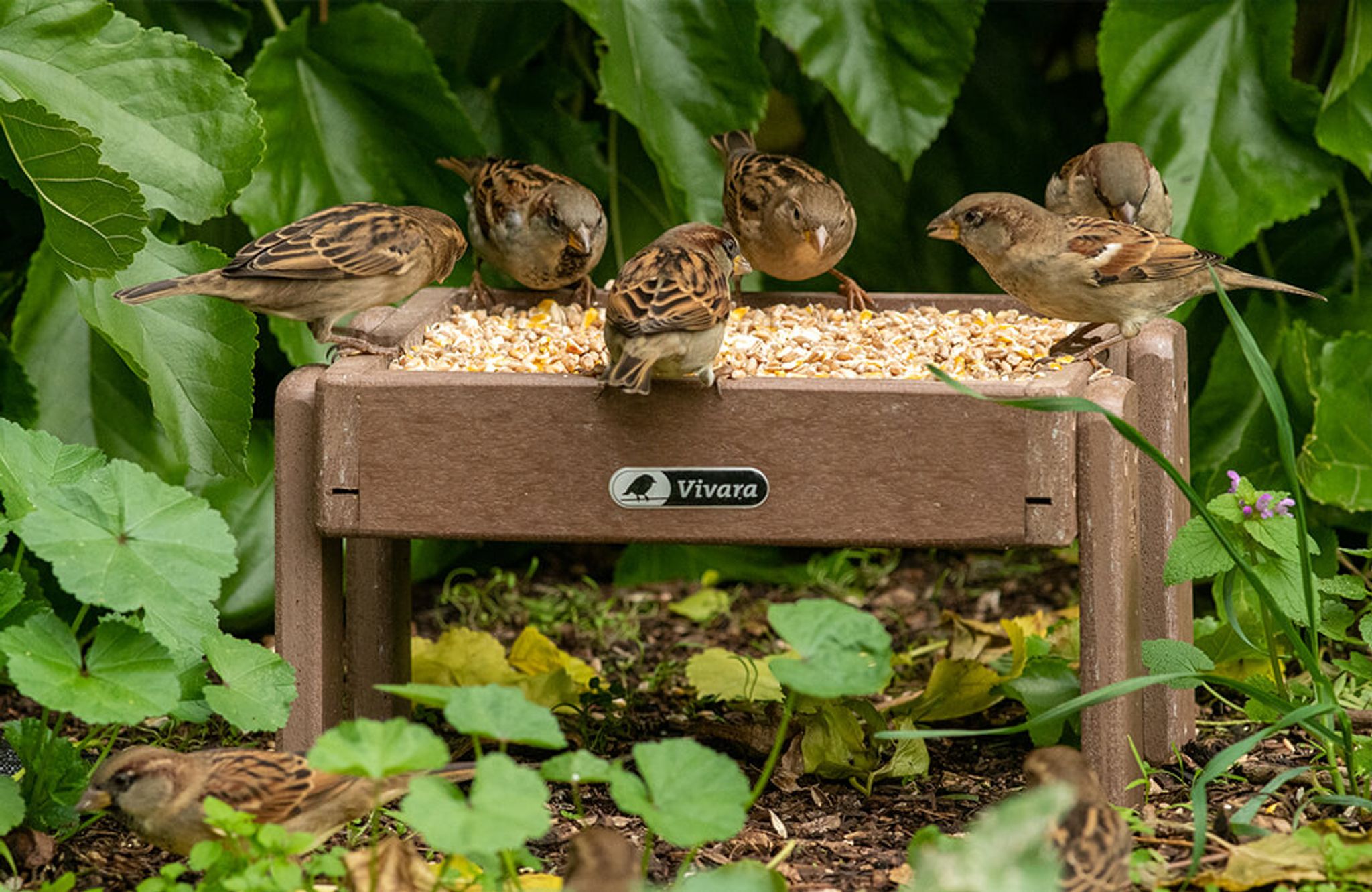 Sperlinge fressen gemeinsam von einem Futtertisch.