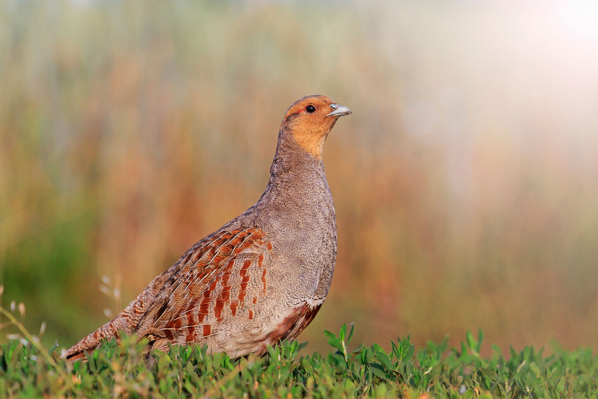 Der Kopf sowie die Streifen auf dem Federkleid sind rotbraun gehalten, weshalb das Rebhuhn aus der Ferne überwiegend grau erscheint.