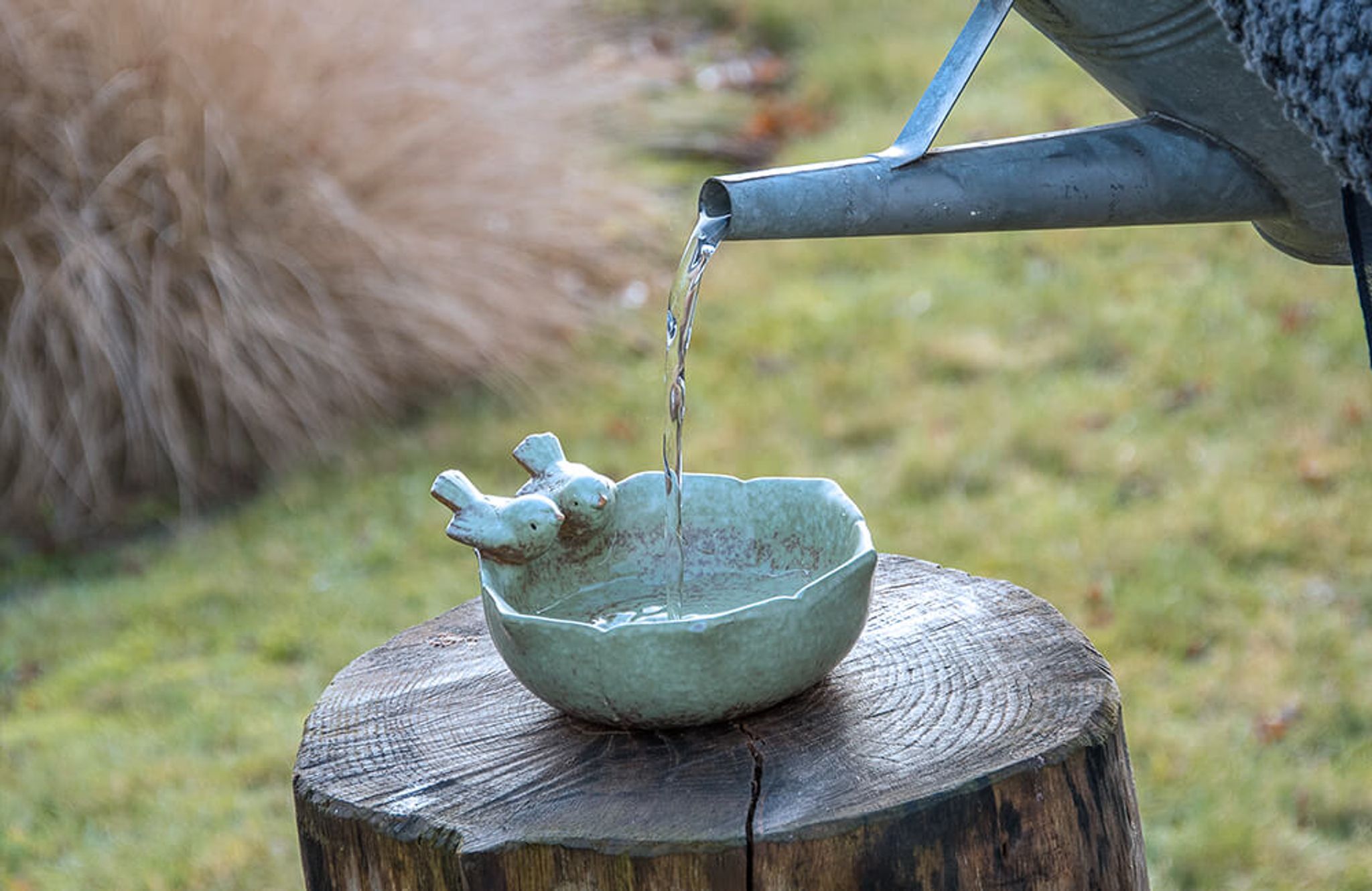 Eine Wasserschale bzw. Vogeltränke sollte aus winterfestem Material bestehen und regelmäßig gewartet werden.